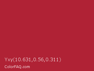 Yxy 10.631,0.56,0.311 Color is a normal red color and the nearest color is Deep Carmine #a9203e. Hex code #b02235 and RGB value is rgb(176,34,53). In RGB color space, this color is composed of 69% red, 13% green, 21% blue, In CMYK color space, this color is composed of 0% cyan, 81% magenta, 70% yellow , 31% black , In HSL color space, this color has a hue angle of 352° , 68% saturation and 41% lightness.