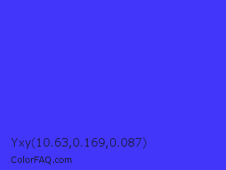 Yxy 10.63,0.169,0.087 Color is a normal indigo color and the nearest color is Han Purple #5218fa. Hex code #4136f9 and RGB value is rgb(65,54,249). In RGB color space, this color is composed of 25% red, 21% green, 98% blue, In CMYK color space, this color is composed of 74% cyan, 78% magenta, 0% yellow , 2% black , In HSL color space, this color has a hue angle of 243° , 94% saturation and 59% lightness.
