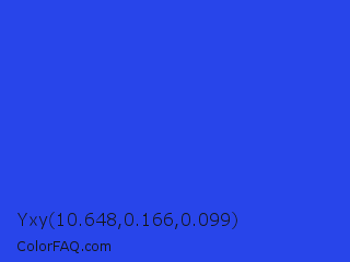 Yxy 10.648,0.166,0.099 Color is a normal blue color and the nearest color is Palatinate Blue #273be2. Hex code #2845ea and RGB value is rgb(40,69,234). In RGB color space, this color is composed of 16% red, 27% green, 92% blue, In CMYK color space, this color is composed of 83% cyan, 71% magenta, 0% yellow , 8% black , In HSL color space, this color has a hue angle of 231° , 82% saturation and 54% lightness.