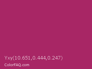 Yxy 10.651,0.444,0.247 Color is a normal rose color and the nearest color is Amaranth Deep Purple #9f2b68. Hex code #a82665 and RGB value is rgb(168,38,101). In RGB color space, this color is composed of 66% red, 15% green, 40% blue, In CMYK color space, this color is composed of 0% cyan, 77% magenta, 40% yellow , 34% black , In HSL color space, this color has a hue angle of 331° , 63% saturation and 40% lightness.