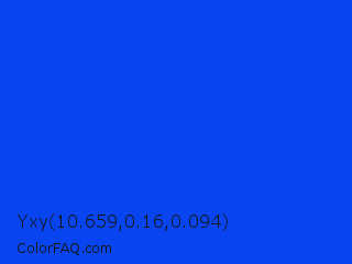 Yxy 10.659,0.16,0.094 Color is a normal blue color and the nearest color is Blue RYB #0247fe. Hex code #0845f1 and RGB value is rgb(8,69,241). In RGB color space, this color is composed of 3% red, 27% green, 95% blue, In CMYK color space, this color is composed of 97% cyan, 71% magenta, 0% yellow , 5% black , In HSL color space, this color has a hue angle of 224° , 94% saturation and 49% lightness.