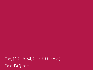 Yxy 10.664,0.53,0.282 Color is a normal rose color and the nearest color is French Wine #ac1e44. Hex code #b31748 and RGB value is rgb(179,23,72). In RGB color space, this color is composed of 70% red, 9% green, 28% blue, In CMYK color space, this color is composed of 0% cyan, 87% magenta, 60% yellow , 30% black , In HSL color space, this color has a hue angle of 341° , 77% saturation and 40% lightness.