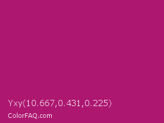 Yxy 10.667,0.431,0.225 Color is a normal magenta color and the nearest color is Lipstick #ab0563. Hex code #ad1770 and RGB value is rgb(173,23,112). In RGB color space, this color is composed of 68% red, 9% green, 44% blue, In CMYK color space, this color is composed of 0% cyan, 87% magenta, 35% yellow , 32% black , In HSL color space, this color has a hue angle of 324° , 77% saturation and 38% lightness.