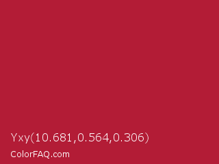 Yxy 10.681,0.564,0.306 Color is a normal red color and the nearest color is Deep Carmine #a9203e. Hex code #b31c36 and RGB value is rgb(179,28,54). In RGB color space, this color is composed of 70% red, 11% green, 21% blue, In CMYK color space, this color is composed of 0% cyan, 84% magenta, 70% yellow , 30% black , In HSL color space, this color has a hue angle of 350° , 73% saturation and 41% lightness.