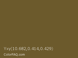 Yxy 10.682,0.414,0.429 Color is a dark orange color and the nearest color is Costa Del Sol #615d30. Hex code #6c5a2c and RGB value is rgb(108,90,44). In RGB color space, this color is composed of 42% red, 35% green, 17% blue, In CMYK color space, this color is composed of 0% cyan, 17% magenta, 59% yellow , 58% black , In HSL color space, this color has a hue angle of 43° , 42% saturation and 30% lightness.