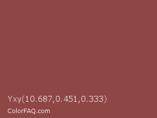 Yxy 10.687,0.451,0.333 Color is a normal red color and the nearest color is Copper Rust #944747. Hex code #8e4745 and RGB value is rgb(142,71,69). In RGB color space, this color is composed of 56% red, 28% green, 27% blue, In CMYK color space, this color is composed of 0% cyan, 50% magenta, 51% yellow , 44% black , In HSL color space, this color has a hue angle of 2° , 35% saturation and 41% lightness.