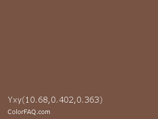 Yxy 10.68,0.402,0.363 Color is a normal orange color and the nearest color is Tobacco Brown #715d47. Hex code #775444 and RGB value is rgb(119,84,68). In RGB color space, this color is composed of 47% red, 33% green, 27% blue, In CMYK color space, this color is composed of 0% cyan, 29% magenta, 43% yellow , 53% black , In HSL color space, this color has a hue angle of 19° , 27% saturation and 37% lightness.