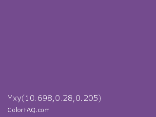 Yxy 10.698,0.28,0.205 Color is a normal purple color and the nearest color is Affair #714693. Hex code #744b8e and RGB value is rgb(116,75,142). In RGB color space, this color is composed of 45% red, 29% green, 56% blue, In CMYK color space, this color is composed of 18% cyan, 47% magenta, 0% yellow , 44% black , In HSL color space, this color has a hue angle of 277° , 31% saturation and 43% lightness.