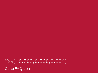 Yxy 10.703,0.568,0.304 Color is a normal red color and the nearest color is Shiraz #b20931. Hex code #b51736 and RGB value is rgb(181,23,54). In RGB color space, this color is composed of 71% red, 9% green, 21% blue, In CMYK color space, this color is composed of 0% cyan, 87% magenta, 70% yellow , 29% black , In HSL color space, this color has a hue angle of 348° , 77% saturation and 40% lightness.