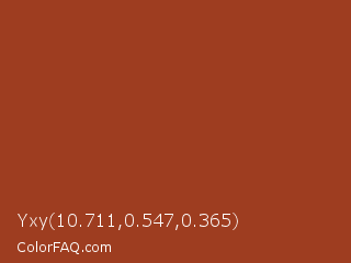 Yxy 10.711,0.547,0.365 Color is a normal red color and the nearest color is Cognac #9f381d. Hex code #9e3d20 and RGB value is rgb(158,61,32). In RGB color space, this color is composed of 62% red, 24% green, 13% blue, In CMYK color space, this color is composed of 0% cyan, 61% magenta, 80% yellow , 38% black , In HSL color space, this color has a hue angle of 14° , 66% saturation and 37% lightness.