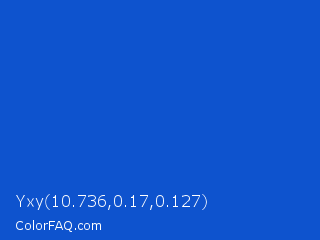 Yxy 10.736,0.17,0.127 Color is a normal blue color and the nearest color is Sapphire #0f52ba. Hex code #0e53ce and RGB value is rgb(14,83,206). In RGB color space, this color is composed of 5% red, 33% green, 81% blue, In CMYK color space, this color is composed of 93% cyan, 60% magenta, 0% yellow , 19% black , In HSL color space, this color has a hue angle of 218° , 87% saturation and 43% lightness.