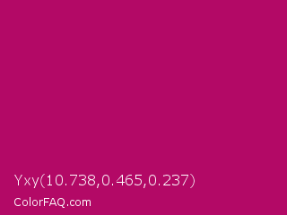 Yxy 10.738,0.465,0.237 Color is a normal magenta color and the nearest color is Lipstick #ab0563. Hex code #b30966 and RGB value is rgb(179,9,102). In RGB color space, this color is composed of 70% red, 4% green, 40% blue, In CMYK color space, this color is composed of 0% cyan, 95% magenta, 43% yellow , 30% black , In HSL color space, this color has a hue angle of 327° , 90% saturation and 37% lightness.