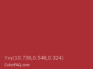 Yxy 10.739,0.548,0.324 Color is a normal red color and the nearest color is Sweet Brown #a83731. Hex code #aa2e33 and RGB value is rgb(170,46,51). In RGB color space, this color is composed of 67% red, 18% green, 20% blue, In CMYK color space, this color is composed of 0% cyan, 73% magenta, 70% yellow , 33% black , In HSL color space, this color has a hue angle of 358° , 57% saturation and 42% lightness.