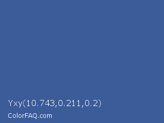 Yxy 10.743,0.211,0.2 Color is a normal blue color and the nearest color is Azure #315ba1. Hex code #3b5b99 and RGB value is rgb(59,91,153). In RGB color space, this color is composed of 23% red, 36% green, 60% blue, In CMYK color space, this color is composed of 61% cyan, 41% magenta, 0% yellow , 40% black , In HSL color space, this color has a hue angle of 220° , 44% saturation and 42% lightness.