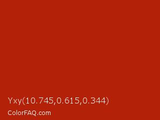 Yxy 10.745,0.615,0.344 Color is a normal red color and the nearest color is Rufous #a81c07. Hex code #b32208 and RGB value is rgb(179,34,8). In RGB color space, this color is composed of 70% red, 13% green, 3% blue, In CMYK color space, this color is composed of 0% cyan, 81% magenta, 96% yellow , 30% black , In HSL color space, this color has a hue angle of 9° , 91% saturation and 37% lightness.