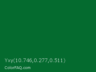 Yxy 10.746,0.277,0.511 Color is a very dark green color and the nearest color is Fun Green #016d39. Hex code #046b2f and RGB value is rgb(4,107,47). In RGB color space, this color is composed of 2% red, 42% green, 18% blue, In CMYK color space, this color is composed of 96% cyan, 0% magenta, 56% yellow , 58% black , In HSL color space, this color has a hue angle of 145° , 93% saturation and 22% lightness.