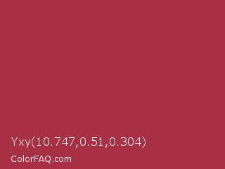 Yxy 10.747,0.51,0.304 Color is a normal red color and the nearest color is Amaranth Purple #ab274f. Hex code #a73044 and RGB value is rgb(167,48,68). In RGB color space, this color is composed of 65% red, 19% green, 27% blue, In CMYK color space, this color is composed of 0% cyan, 71% magenta, 59% yellow , 35% black , In HSL color space, this color has a hue angle of 350° , 55% saturation and 42% lightness.