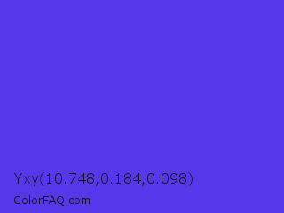 Yxy 10.748,0.184,0.098 Color is a normal indigo color and the nearest color is Majorelle Blue #6050dc. Hex code #5737ea and RGB value is rgb(87,55,234). In RGB color space, this color is composed of 34% red, 22% green, 92% blue, In CMYK color space, this color is composed of 63% cyan, 76% magenta, 0% yellow , 8% black , In HSL color space, this color has a hue angle of 251° , 81% saturation and 57% lightness.