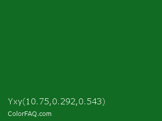 Yxy 10.75,0.292,0.543 Color is a dark green color and the nearest color is La Salle Green #087830. Hex code #116b22 and RGB value is rgb(17,107,34). In RGB color space, this color is composed of 7% red, 42% green, 13% blue, In CMYK color space, this color is composed of 84% cyan, 0% magenta, 68% yellow , 58% black , In HSL color space, this color has a hue angle of 131° , 73% saturation and 24% lightness.