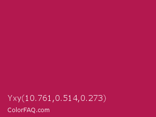 Yxy 10.761,0.514,0.273 Color is a normal rose color and the nearest color is French Wine #ac1e44. Hex code #b3184f and RGB value is rgb(179,24,79). In RGB color space, this color is composed of 70% red, 9% green, 31% blue, In CMYK color space, this color is composed of 0% cyan, 87% magenta, 56% yellow , 30% black , In HSL color space, this color has a hue angle of 339° , 76% saturation and 40% lightness.