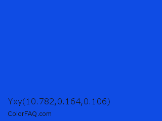 Yxy 10.782,0.164,0.106 Color is a normal blue color and the nearest color is Palatinate Blue #273be2. Hex code #0f4ce4 and RGB value is rgb(15,76,228). In RGB color space, this color is composed of 6% red, 30% green, 89% blue, In CMYK color space, this color is composed of 93% cyan, 67% magenta, 0% yellow , 11% black , In HSL color space, this color has a hue angle of 223° , 88% saturation and 48% lightness.