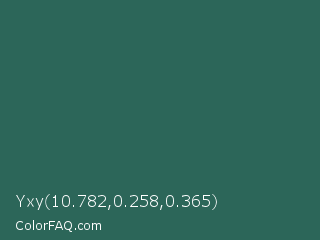 Yxy 10.782,0.258,0.365 Color is a dark cyan color and the nearest color is Spectra #2f5a57. Hex code #2c6659 and RGB value is rgb(44,102,89). In RGB color space, this color is composed of 17% red, 40% green, 35% blue, In CMYK color space, this color is composed of 57% cyan, 0% magenta, 13% yellow , 60% black , In HSL color space, this color has a hue angle of 167° , 40% saturation and 29% lightness.