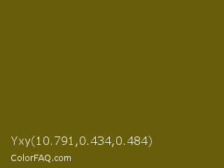 Yxy 10.791,0.434,0.484 Color is a very dark yellow color and the nearest color is Spicy Mustard #74640d. Hex code #685d09 and RGB value is rgb(104,93,9). In RGB color space, this color is composed of 41% red, 36% green, 4% blue, In CMYK color space, this color is composed of 0% cyan, 11% magenta, 91% yellow , 59% black , In HSL color space, this color has a hue angle of 53° , 84% saturation and 22% lightness.