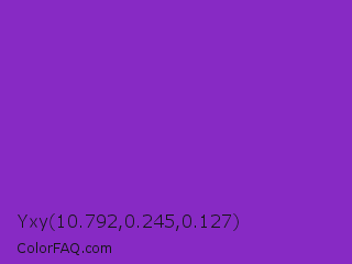 Yxy 10.792,0.245,0.127 Color is a normal purple color and the nearest color is Dark Orchid #9932cc. Hex code #872ac4 and RGB value is rgb(135,42,196). In RGB color space, this color is composed of 53% red, 16% green, 77% blue, In CMYK color space, this color is composed of 31% cyan, 79% magenta, 0% yellow , 23% black , In HSL color space, this color has a hue angle of 276° , 65% saturation and 47% lightness.