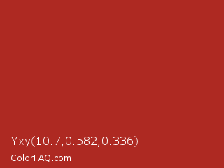 Yxy 10.7,0.582,0.336 Color is a normal red color and the nearest color is Firebrick #b22222. Hex code #ae2922 and RGB value is rgb(174,41,34). In RGB color space, this color is composed of 68% red, 16% green, 13% blue, In CMYK color space, this color is composed of 0% cyan, 76% magenta, 80% yellow , 32% black , In HSL color space, this color has a hue angle of 3° , 67% saturation and 41% lightness.