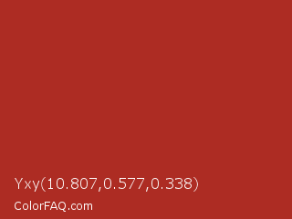 Yxy 10.807,0.577,0.338 Color is a normal red color and the nearest color is Roof Terracotta #a62f20. Hex code #ad2c23 and RGB value is rgb(173,44,35). In RGB color space, this color is composed of 68% red, 17% green, 14% blue, In CMYK color space, this color is composed of 0% cyan, 75% magenta, 80% yellow , 32% black , In HSL color space, this color has a hue angle of 4° , 66% saturation and 41% lightness.