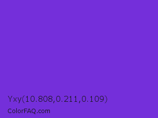 Yxy 10.808,0.211,0.109 Color is a normal violet color and the nearest color is Blue Violet #8a2be2. Hex code #742fda and RGB value is rgb(116,47,218). In RGB color space, this color is composed of 45% red, 18% green, 85% blue, In CMYK color space, this color is composed of 47% cyan, 78% magenta, 0% yellow , 15% black , In HSL color space, this color has a hue angle of 264° , 70% saturation and 52% lightness.