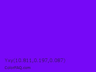 Yxy 10.811,0.197,0.087 Color is a normal violet color and the nearest color is Electric Indigo #6f00ff. Hex code #7708f7 and RGB value is rgb(119,8,247). In RGB color space, this color is composed of 47% red, 3% green, 97% blue, In CMYK color space, this color is composed of 52% cyan, 97% magenta, 0% yellow , 3% black , In HSL color space, this color has a hue angle of 268° , 94% saturation and 50% lightness.