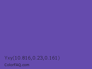 Yxy 10.816,0.23,0.161 Color is a normal indigo color and the nearest color is Studio #714ab2. Hex code #654bad and RGB value is rgb(101,75,173). In RGB color space, this color is composed of 40% red, 29% green, 68% blue, In CMYK color space, this color is composed of 42% cyan, 57% magenta, 0% yellow , 32% black , In HSL color space, this color has a hue angle of 256° , 40% saturation and 49% lightness.