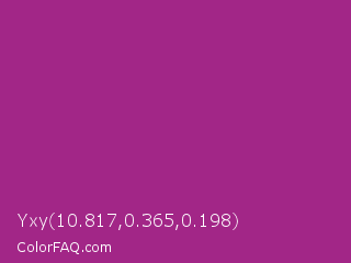 Yxy 10.817,0.365,0.198 Color is a normal magenta color and the nearest color is Fandango #b53389. Hex code #a22687 and RGB value is rgb(162,38,135). In RGB color space, this color is composed of 64% red, 15% green, 53% blue, In CMYK color space, this color is composed of 0% cyan, 77% magenta, 17% yellow , 36% black , In HSL color space, this color has a hue angle of 313° , 62% saturation and 39% lightness.