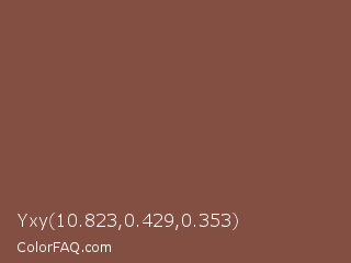 Yxy 10.823,0.429,0.353 Color is a normal red color and the nearest color is Spicy Mix #885342. Hex code #834f43 and RGB value is rgb(131,79,67). In RGB color space, this color is composed of 51% red, 31% green, 26% blue, In CMYK color space, this color is composed of 0% cyan, 40% magenta, 49% yellow , 49% black , In HSL color space, this color has a hue angle of 11° , 32% saturation and 39% lightness.