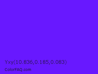 Yxy 10.836,0.185,0.083 Color is a normal violet color and the nearest color is Han Purple #5218fa. Hex code #6818ff and RGB value is rgb(104,24,255). In RGB color space, this color is composed of 41% red, 9% green, 100% blue, In CMYK color space, this color is composed of 59% cyan, 91% magenta, 0% yellow , 0% black , In HSL color space, this color has a hue angle of 261° , 100% saturation and 55% lightness.