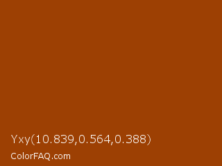 Yxy 10.839,0.564,0.388 Color is a normal orange color and the nearest color is Oregon #9b4703. Hex code #9d4003 and RGB value is rgb(157,64,3). In RGB color space, this color is composed of 62% red, 25% green, 1% blue, In CMYK color space, this color is composed of 0% cyan, 59% magenta, 98% yellow , 38% black , In HSL color space, this color has a hue angle of 24° , 96% saturation and 31% lightness.