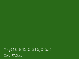 Yxy 10.845,0.316,0.55 Color is a dark green color and the nearest color is Dell #396413. Hex code #296a18 and RGB value is rgb(41,106,24). In RGB color space, this color is composed of 16% red, 42% green, 9% blue, In CMYK color space, this color is composed of 61% cyan, 0% magenta, 77% yellow , 58% black , In HSL color space, this color has a hue angle of 108° , 63% saturation and 25% lightness.