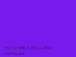 Yxy 10.846,0.203,0.094 Color is a normal violet color and the nearest color is Blue Violet #8a2be2. Hex code #781aed and RGB value is rgb(120,26,237). In RGB color space, this color is composed of 47% red, 10% green, 93% blue, In CMYK color space, this color is composed of 49% cyan, 89% magenta, 0% yellow , 7% black , In HSL color space, this color has a hue angle of 267° , 85% saturation and 52% lightness.