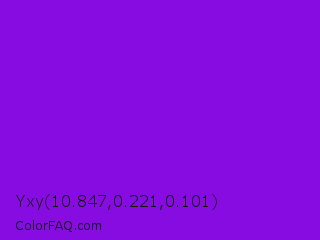 Yxy 10.847,0.221,0.101 Color is a normal purple color and the nearest color is French Violet #8806ce. Hex code #860ce2 and RGB value is rgb(134,12,226). In RGB color space, this color is composed of 53% red, 5% green, 89% blue, In CMYK color space, this color is composed of 41% cyan, 95% magenta, 0% yellow , 11% black , In HSL color space, this color has a hue angle of 274° , 90% saturation and 47% lightness.