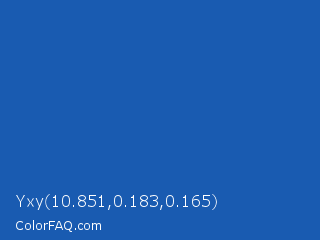 Yxy 10.851,0.183,0.165 Color is a normal blue color and the nearest color is Fun Blue #1959a8. Hex code #195bb1 and RGB value is rgb(25,91,177). In RGB color space, this color is composed of 10% red, 36% green, 69% blue, In CMYK color space, this color is composed of 86% cyan, 49% magenta, 0% yellow , 31% black , In HSL color space, this color has a hue angle of 214° , 75% saturation and 40% lightness.