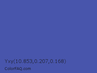 Yxy 10.853,0.207,0.168 Color is a normal blue color and the nearest color is Liberty #545aa7. Hex code #4855ac and RGB value is rgb(72,85,172). In RGB color space, this color is composed of 28% red, 33% green, 67% blue, In CMYK color space, this color is composed of 58% cyan, 51% magenta, 0% yellow , 33% black , In HSL color space, this color has a hue angle of 232° , 41% saturation and 48% lightness.