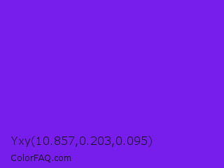 Yxy 10.857,0.203,0.095 Color is a normal violet color and the nearest color is Blue Violet #8a2be2. Hex code #771dec and RGB value is rgb(119,29,236). In RGB color space, this color is composed of 47% red, 11% green, 93% blue, In CMYK color space, this color is composed of 50% cyan, 88% magenta, 0% yellow , 7% black , In HSL color space, this color has a hue angle of 266° , 84% saturation and 52% lightness.