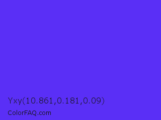Yxy 10.861,0.181,0.09 Color is a normal indigo color and the nearest color is Han Purple #5218fa. Hex code #5a2ff6 and RGB value is rgb(90,47,246). In RGB color space, this color is composed of 35% red, 18% green, 96% blue, In CMYK color space, this color is composed of 63% cyan, 81% magenta, 0% yellow , 4% black , In HSL color space, this color has a hue angle of 253° , 92% saturation and 57% lightness.