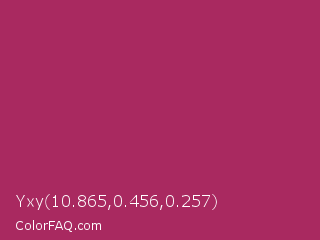 Yxy 10.865,0.456,0.257 Color is a normal rose color and the nearest color is Rich Maroon #b03060. Hex code #a92960 and RGB value is rgb(169,41,96). In RGB color space, this color is composed of 66% red, 16% green, 38% blue, In CMYK color space, this color is composed of 0% cyan, 76% magenta, 43% yellow , 34% black , In HSL color space, this color has a hue angle of 334° , 61% saturation and 41% lightness.