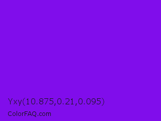 Yxy 10.875,0.21,0.095 Color is a normal purple color and the nearest color is Violet Color Wheel #7f00ff. Hex code #800deb and RGB value is rgb(128,13,235). In RGB color space, this color is composed of 50% red, 5% green, 92% blue, In CMYK color space, this color is composed of 46% cyan, 94% magenta, 0% yellow , 8% black , In HSL color space, this color has a hue angle of 271° , 90% saturation and 49% lightness.