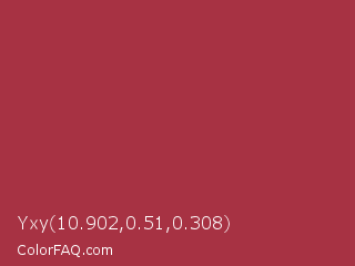 Yxy 10.902,0.51,0.308 Color is a normal red color and the nearest color is Amaranth Purple #ab274f. Hex code #a73243 and RGB value is rgb(167,50,67). In RGB color space, this color is composed of 65% red, 20% green, 26% blue, In CMYK color space, this color is composed of 0% cyan, 70% magenta, 60% yellow , 35% black , In HSL color space, this color has a hue angle of 351° , 54% saturation and 43% lightness.