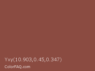 Yxy 10.903,0.45,0.347 Color is a normal red color and the nearest color is Ironstone #86483c. Hex code #8b4b41 and RGB value is rgb(139,75,65). In RGB color space, this color is composed of 55% red, 29% green, 25% blue, In CMYK color space, this color is composed of 0% cyan, 46% magenta, 53% yellow , 45% black , In HSL color space, this color has a hue angle of 8° , 36% saturation and 40% lightness.