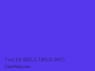 Yxy 10.922,0.183,0.097 Color is a normal indigo color and the nearest color is Majorelle Blue #6050dc. Hex code #5737ed and RGB value is rgb(87,55,237). In RGB color space, this color is composed of 34% red, 22% green, 93% blue, In CMYK color space, this color is composed of 63% cyan, 77% magenta, 0% yellow , 7% black , In HSL color space, this color has a hue angle of 251° , 83% saturation and 57% lightness.