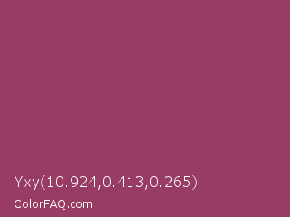 Yxy 10.924,0.413,0.265 Color is a normal rose color and the nearest color is Vin Rouge #983d61. Hex code #993c64 and RGB value is rgb(153,60,100). In RGB color space, this color is composed of 60% red, 24% green, 39% blue, In CMYK color space, this color is composed of 0% cyan, 61% magenta, 35% yellow , 40% black , In HSL color space, this color has a hue angle of 334° , 44% saturation and 42% lightness.